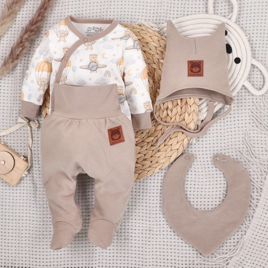 4-dílná soupravička značky NINI z kolekce Méďa Pilot - obsahuje designově sladěné: polodupačky, zavinovací body, zavazovací čepička a slintáček: