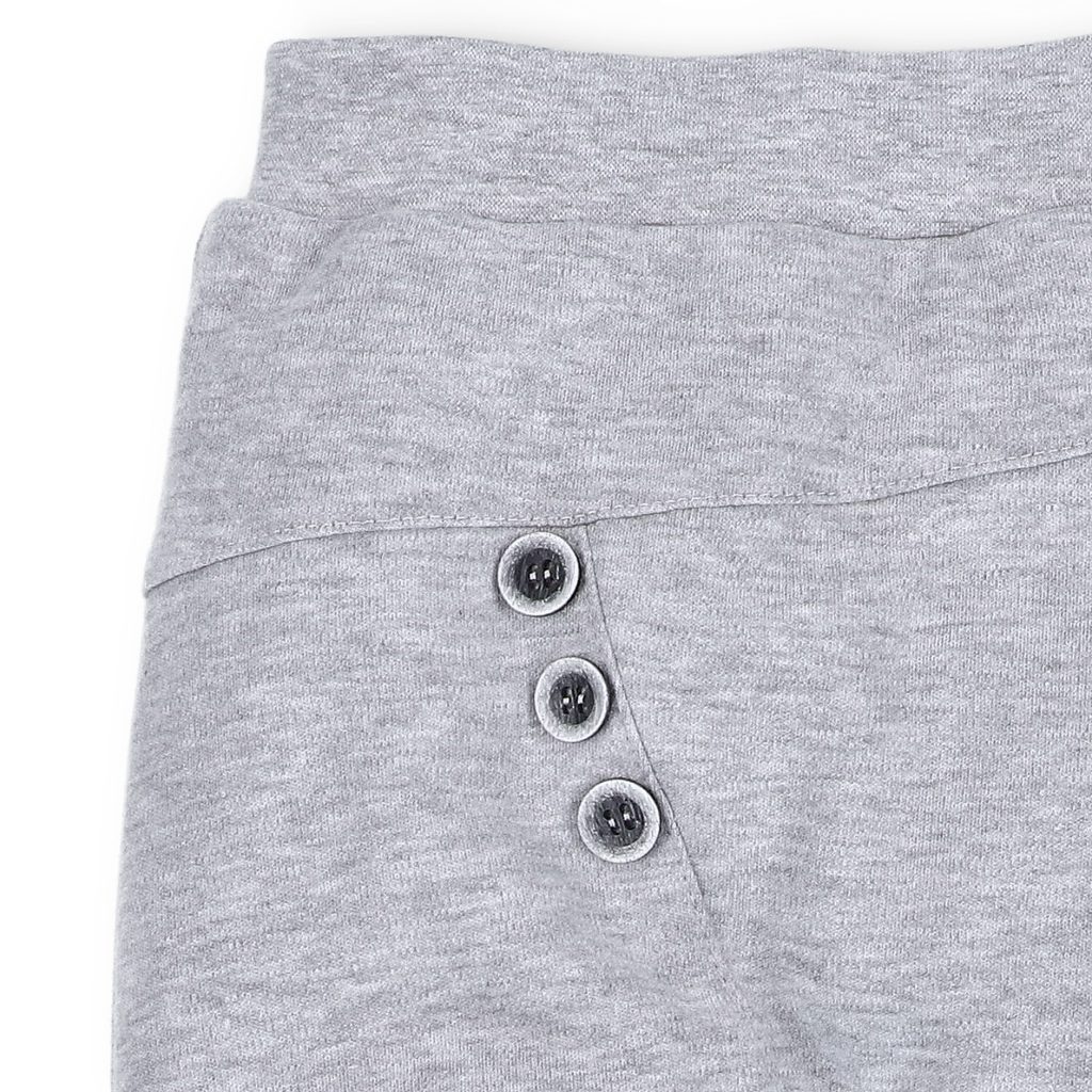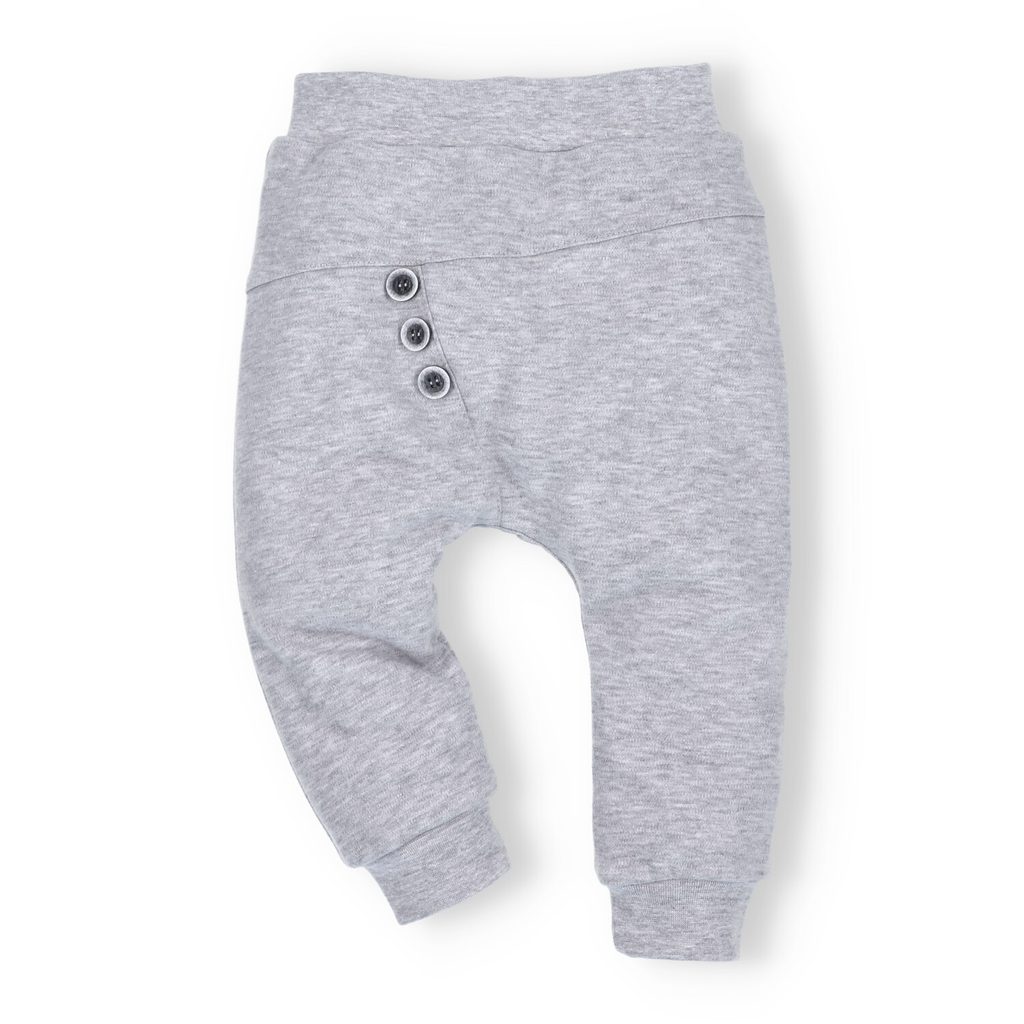 Dvouvrstvé tepláčky z kolekce Space Tour značky NINI. Design: šedý melír s ozdobnými knoflíky.