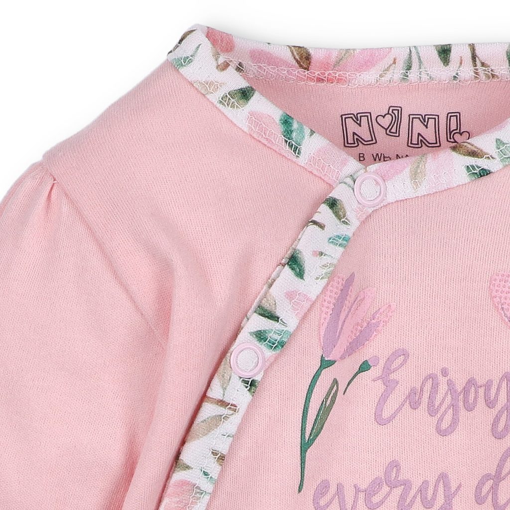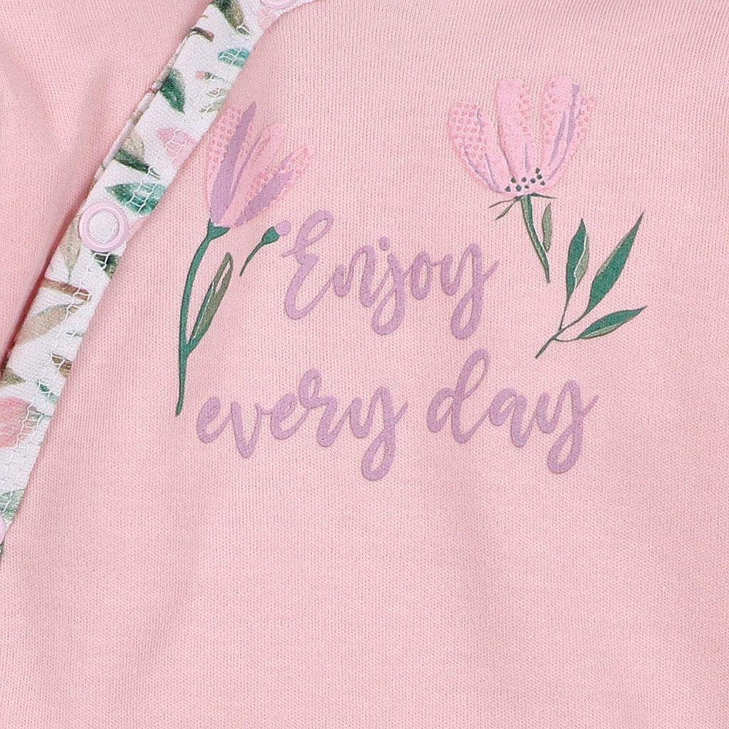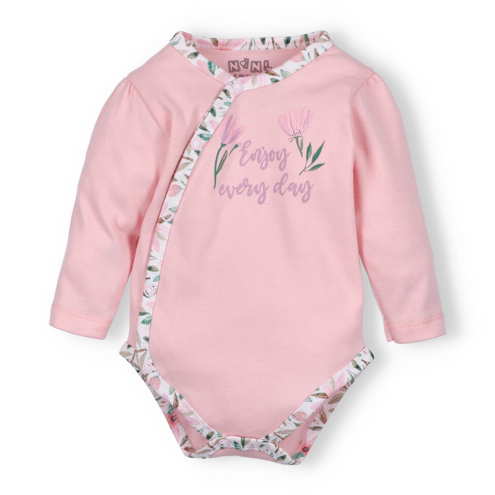 Zavinovací body s dlouhým rukávem z kolekce Pink Flowers značky NINI. Design: růžová s obrázkem květiny a nápisem enjoy every day, květinové lemy: