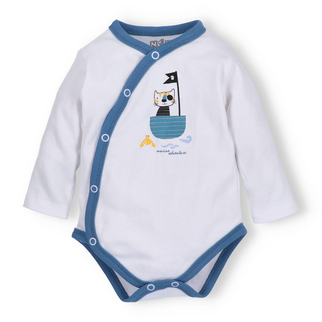 Zavinovací body s dlouhým rukávem z kolekce Pirates značky NINI. Design: BÍLÉ, pirátský a zvířecí motiv na bílém podkladu, modré lemování: