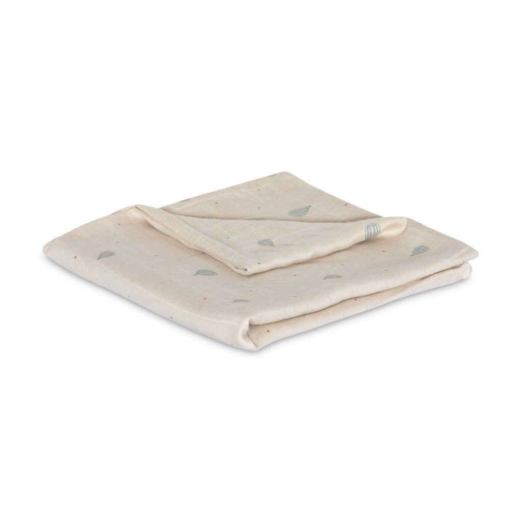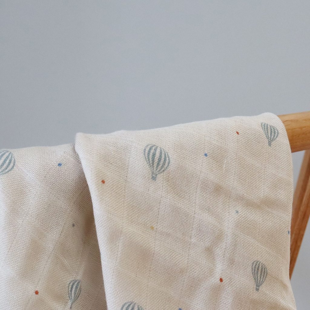 Bambusová mušelínová zavinovací plena / osuška 110x110 cm dánské značky NUUROO z řady Valentin - design Air Baloon Dot (modré létající balóny na béžovém podkladu):