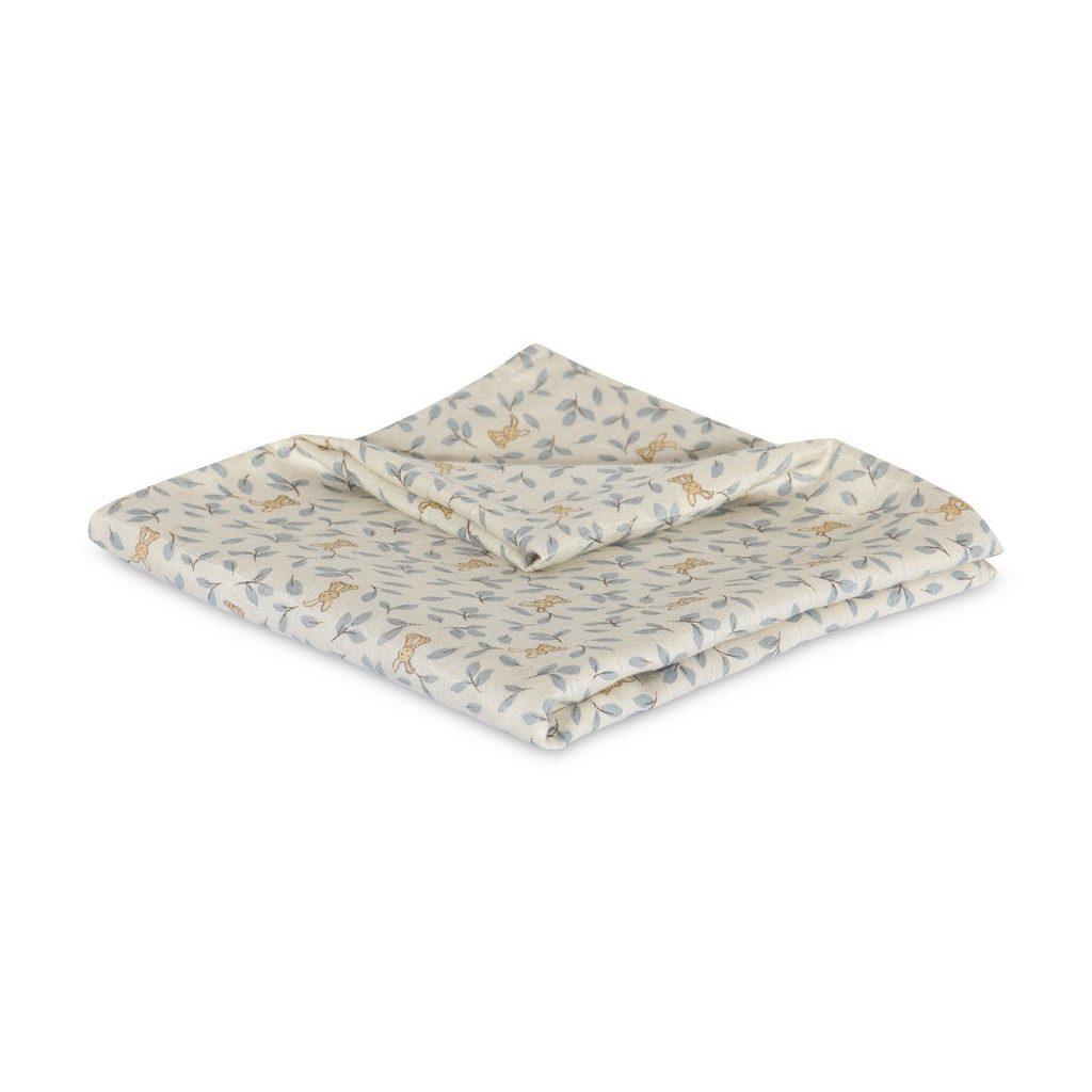 Bambusová mušelínová zavinovací plena / osuška 110x110 cm dánské značky NUUROO z řady Valentin - design Bunny Leaf (králíčci a modré lístky na béžovém podkladu):