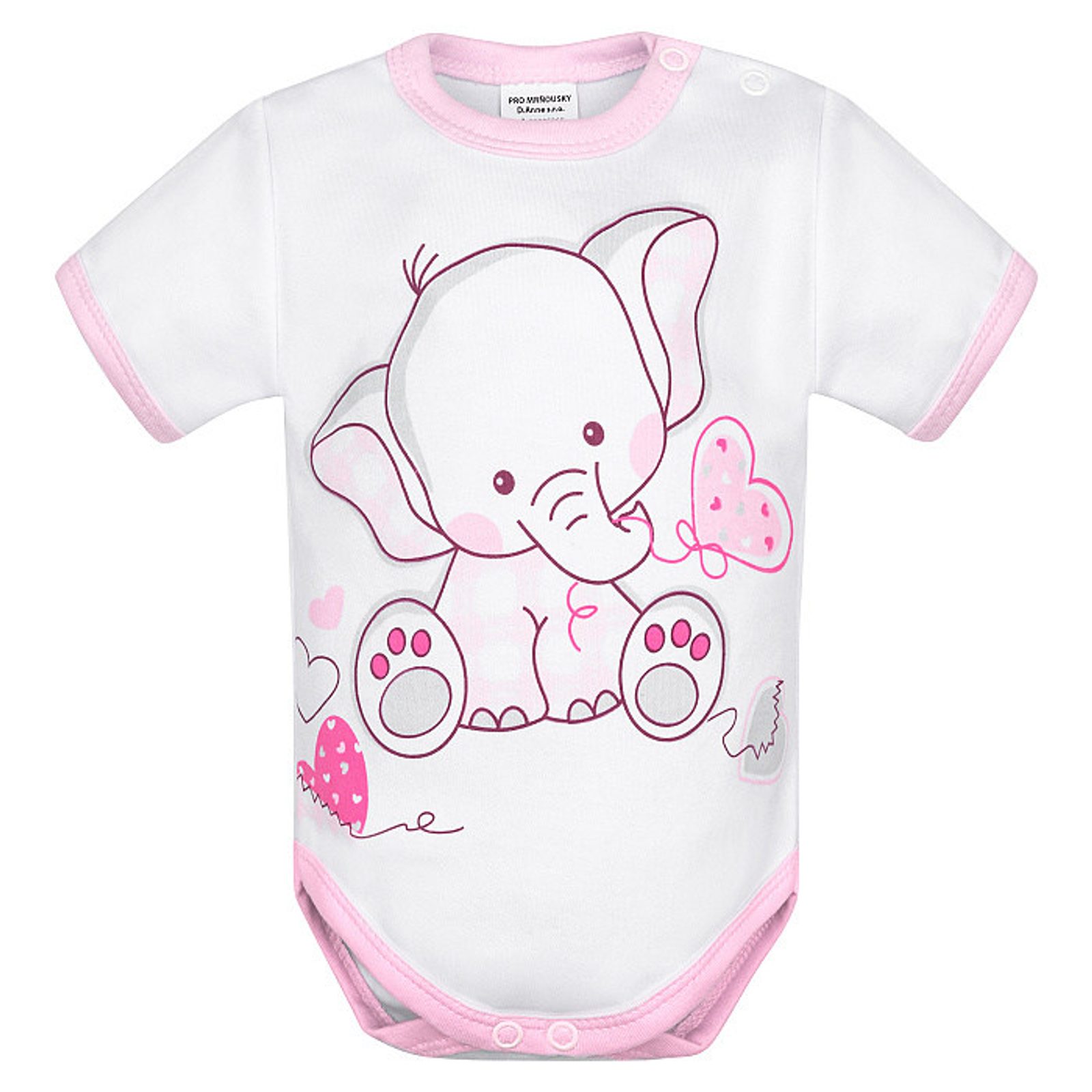 Kojenecké body s krátkým rukávem a potiskem kolekce SLONÍK - v BÍLO-RŮŽOVÉ barevné kombinaci. Značka: PRO MRŇOUSKY. Vyrobené ze 100% bavlny. Kojenecké body má: