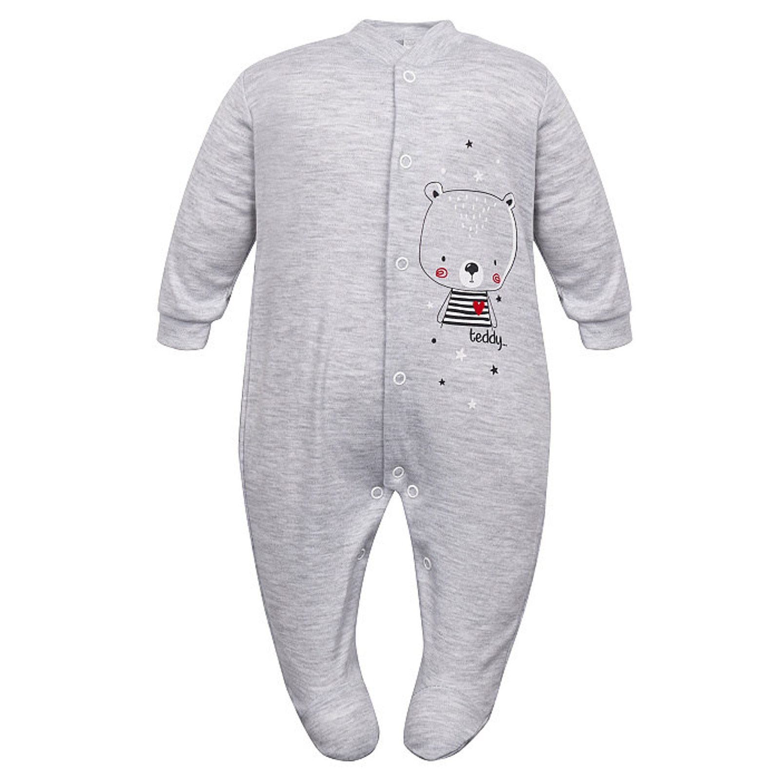 Kojenecký overal s potiskem kolekce TEDDY BEAR v barvě ŠEDÝ MELÍR. Značka: PRO MRŇOUSKY. Vyrobený ze 100% bavlny.