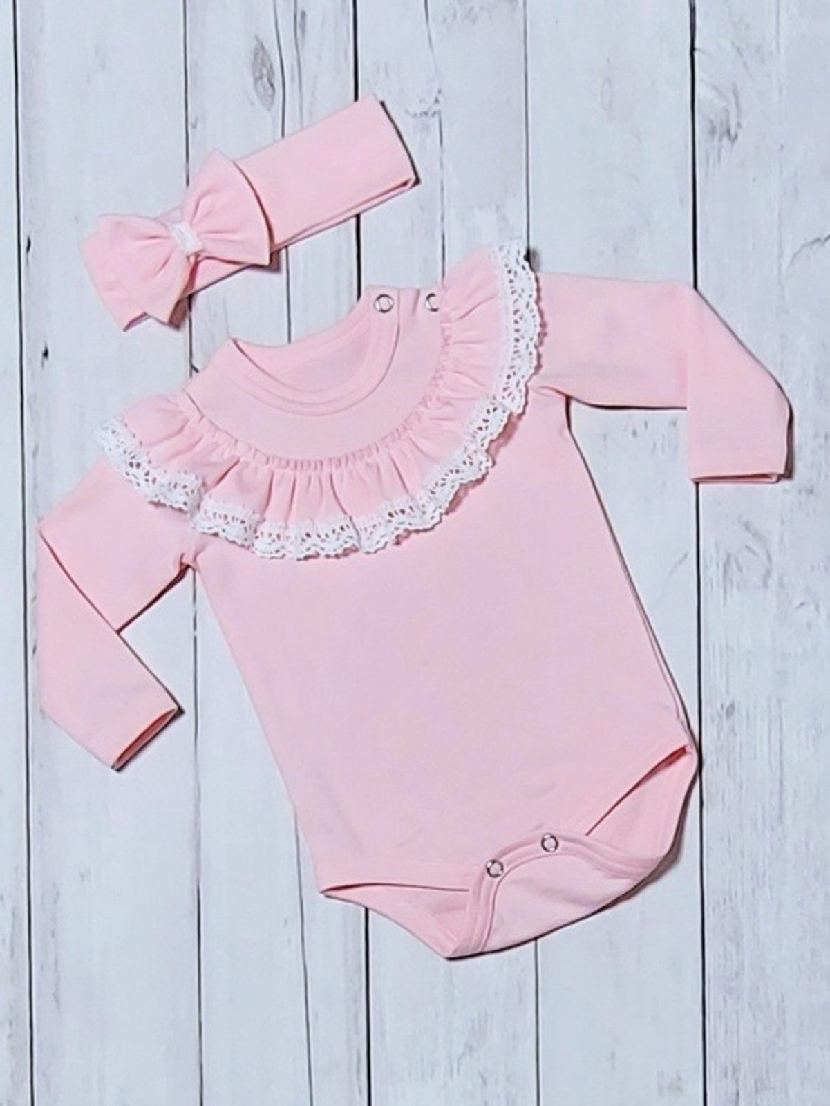 Body s dlouhým rukávem a volánkem na hrudi lemovaným krajkou značky Bambarillo z kolekce Eliza v RŮŽOVÉ barvě:
