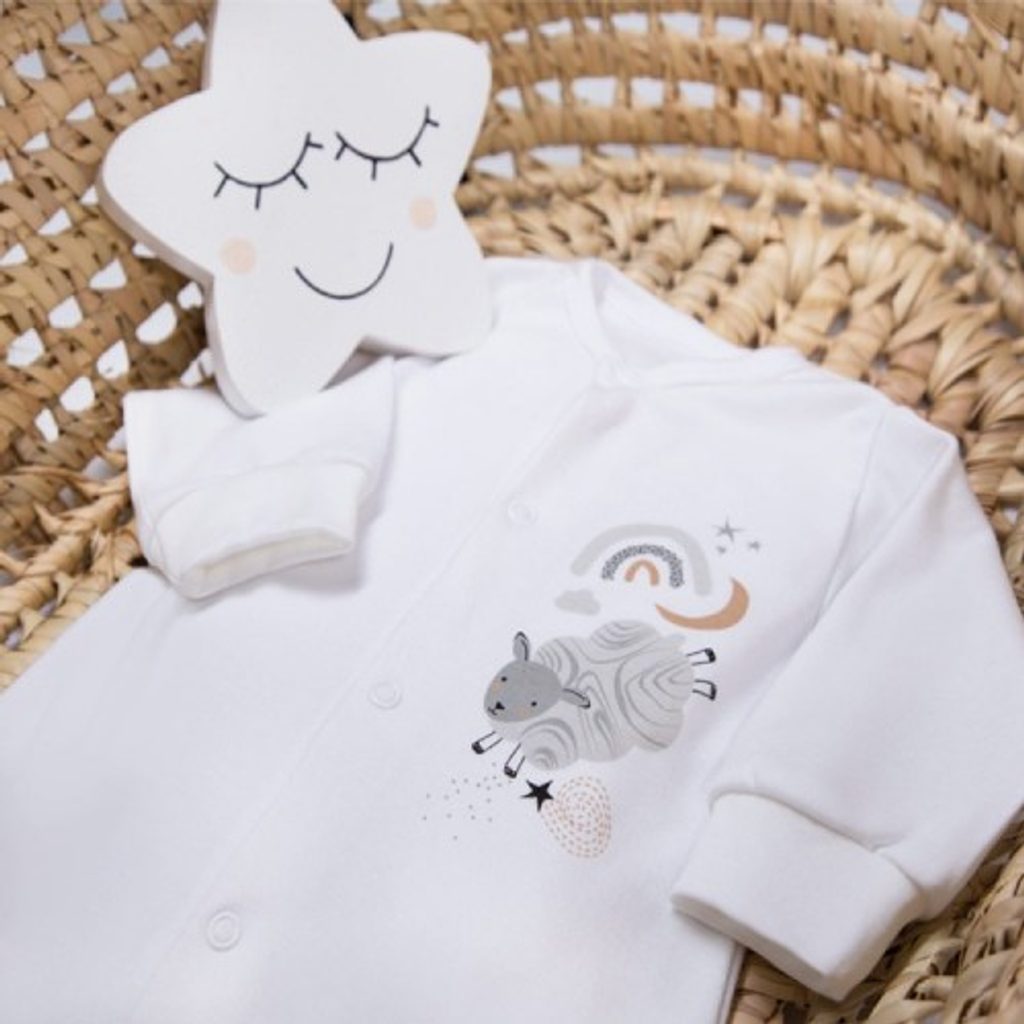 Kojenecký overal značky Eevi z kolekce Mellow - BÍLÝ: s obrázkem beránka, celorozepínací pro pohodlné oblékání (zapínání v těle a mezi nožkana na druky), jersey úplet (100% bavlna), evropský výrobce s více než 20-letou historií. Slaďte s dalšími kousky oblečení z kolekce Mellow značky Eevi!…