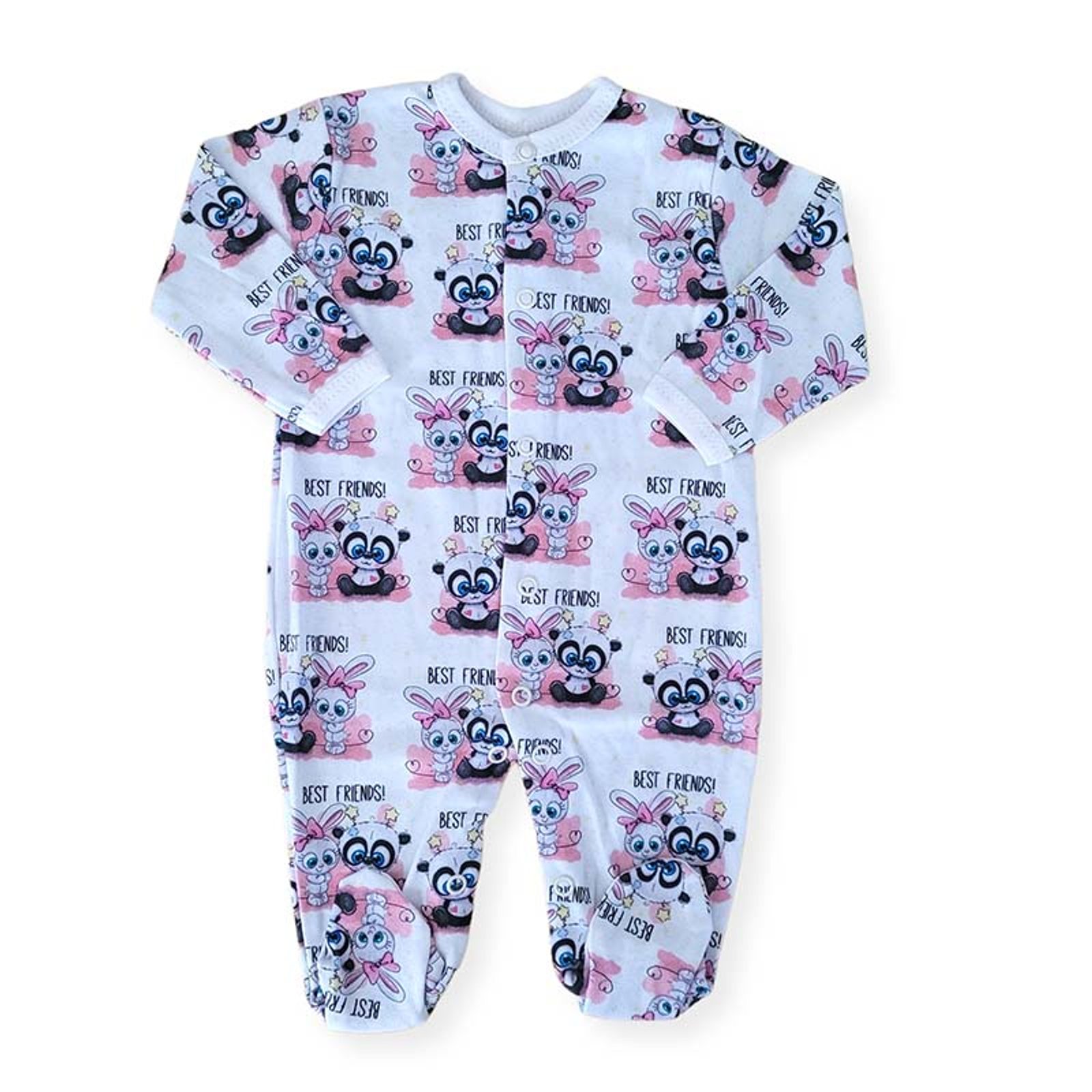 Kojenecký overal značky Le Bebe vzor Duo Panda a Zajíček: celopropínací v těle i mezi nožičkama na patentky, vzor zhotoven moderní metodou digitálního tisku, materiál: 100% bavlna (jersey úplet), vyrobeno v EU.