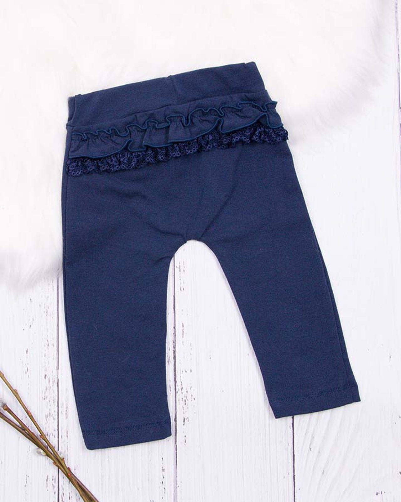 Módní legíny Lea s volánky doplněnými krajkou na zadečku značky Mrofi TMAVĚ MODRÉ