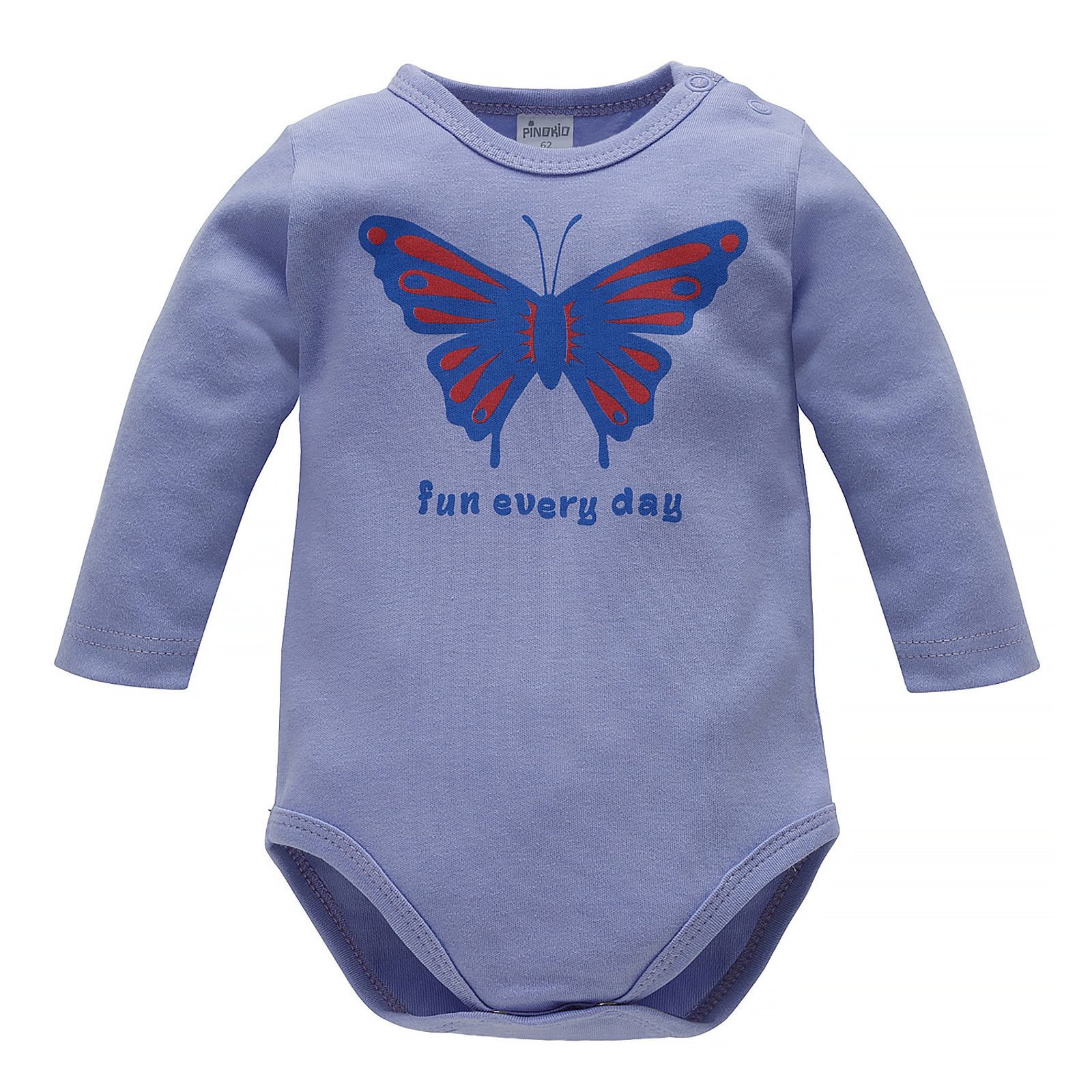 Kojenecké body s dlouhým rukávem značky PINOKIO z kolekce Imagine ve FIALOVÉ barvě s obrázkem motýla vpředu: