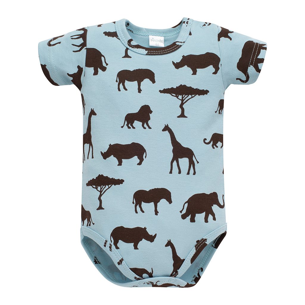 Stylové dětské bodýčko s krátkým rukávem z kolekce Safari značky PINOKIO - v modré barvě s motivem afrických zvířat:
