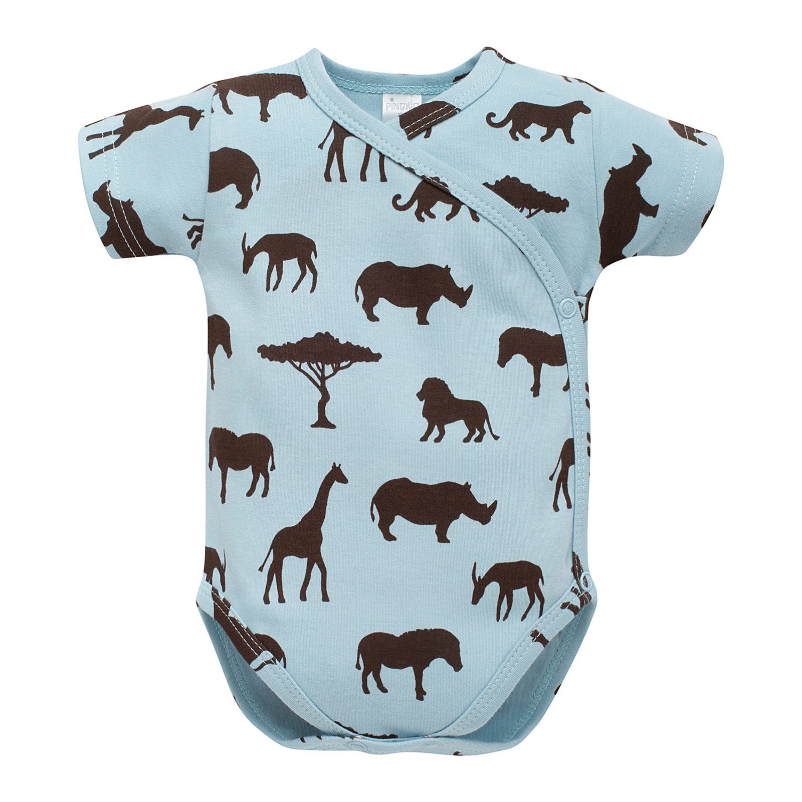 Zavinovací kojenecké body s krátkým rukávem značky PINOKIO z kolekce Safari v modré barvě s motivem afrických zvířat: