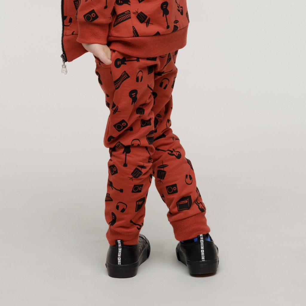 Dětské tepláky značky PINOKIO z kolekce Let´s rock v cihlové barvě s tématickým potiskem:
