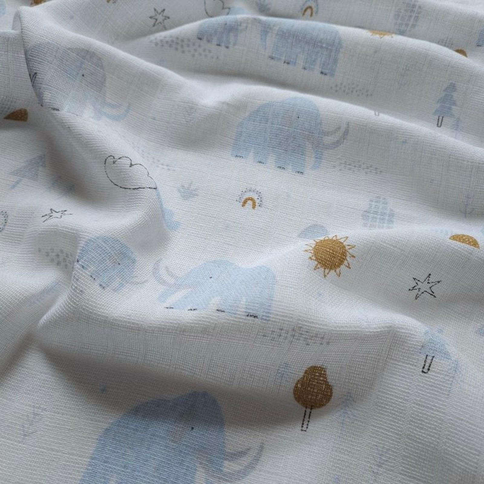 Bavlněná látková plena s potiskem o rozměru 70x70cm výrobce PREM - vzor MAMUT MODRÝ: tetra plena = tkaná v klasické dutinné vazbě s typickou čtvercovou strukturou, 2 okraje pevně vytkávané a 2 pevně založené okraje, materiál 100% bavlna.     Gramáž tkaniny: 115g/m2.
