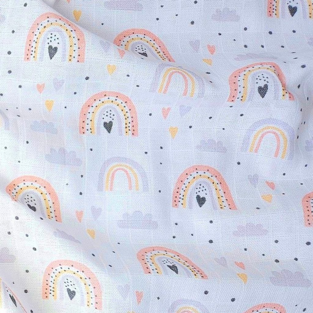 Tetra osuška o rozměru 90x100cm s veselým potiskem DUHA A SRDÍČKA značky PREM International. Tetra osuška je vlastně velká plena, vyrobená z plenkového materiálu vyšší gramáže (tj. silnějšího materiálu oproti běžným plenám rozměru 70x70cm), tkaná v klasické dutinné vazbě s typickou čtvercovou (tetra) strukturou. Díky tomuto typu tkaní a vyšší gramáži materiálu je osuška opticky plnější. Vyrobená ze 100% bavlny. Tetra osuška má 2 okraje pevně vytkávané a 2 pevně založené okraje (což minimalizuje možnost třepení okrajů při praní a jejím používání).
