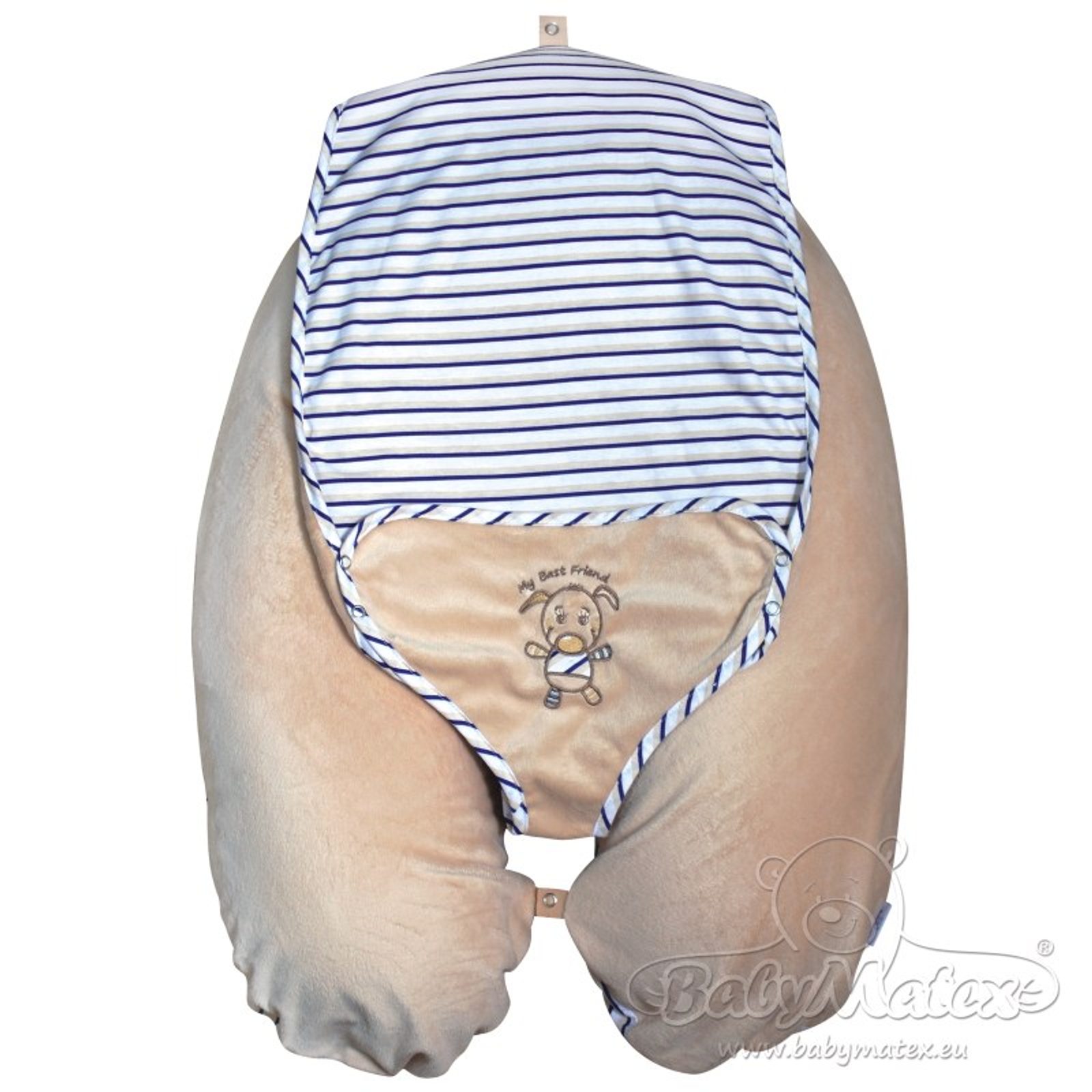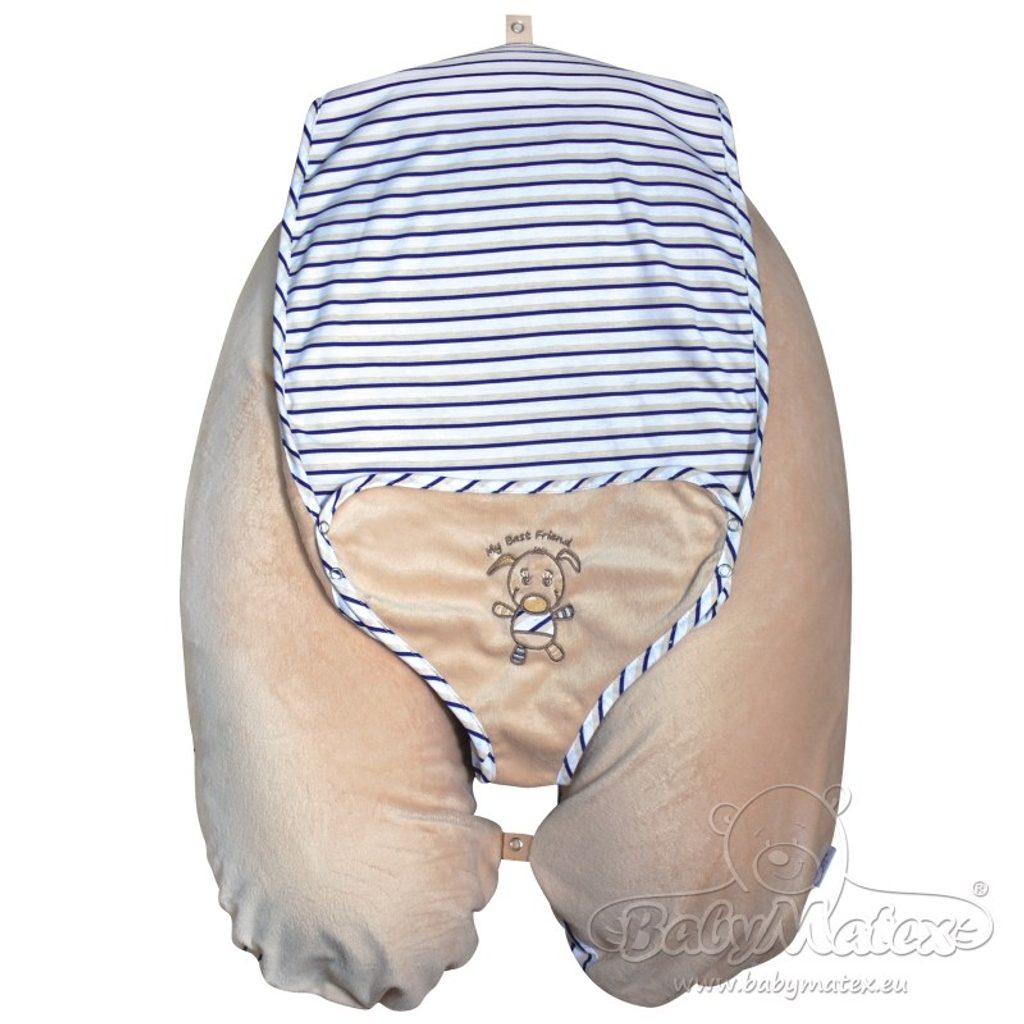 Tento kojící polštář má snímatelný potah ( z jedné strany jednobarevný HNĚDÝ (samet), z druhé strany PRUHOVANÝ (bavlna) jako lehátko), oba materiály jsou velmi příjemné na dotek. Vnitřní náplň kojícího polštáře je ze speciálního kuličkového mikrogranulátu, díky kterému je kojící polštář snadno tvarovatelný a lehce se přizůsobí. Snímatelný potah kojícího polštáře zaručuje jeho snadnou údržbu. Délka kojícího polštáře je 170cm (měřeno při vnější straně).