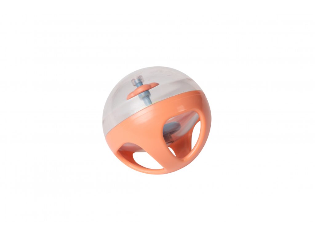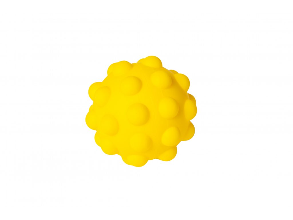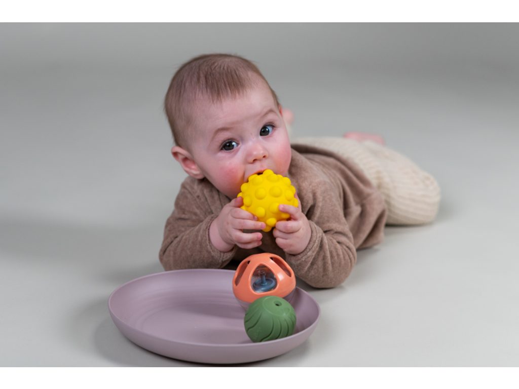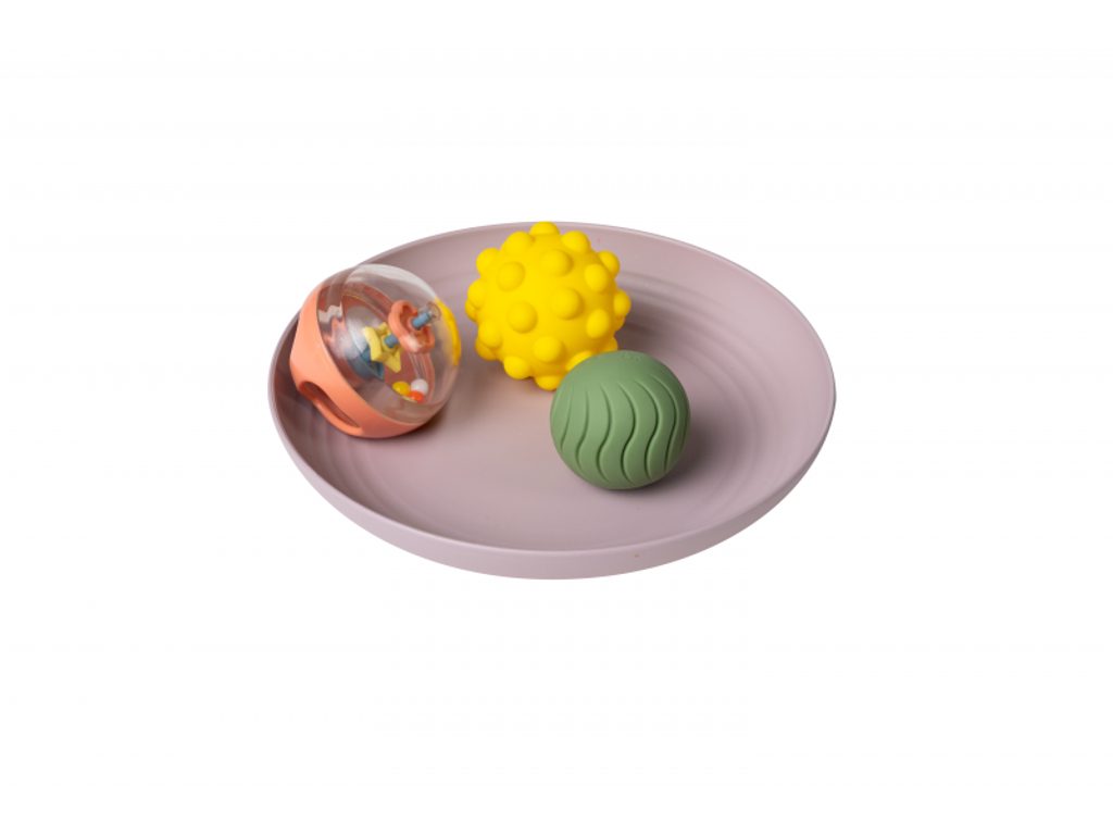 Tři senzorické míčky - průhledný s korálky, žlutý s výstupky a zelený s texturou - lákají ke zkoumání rukama i ústy. Podnos se zvýšenými okraji umožňuje umístit míčky před dítě, aniž by se mu rozkutálely.