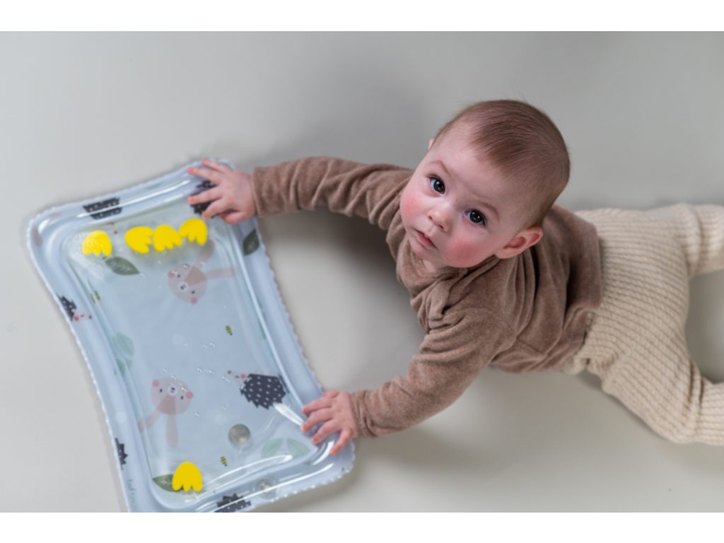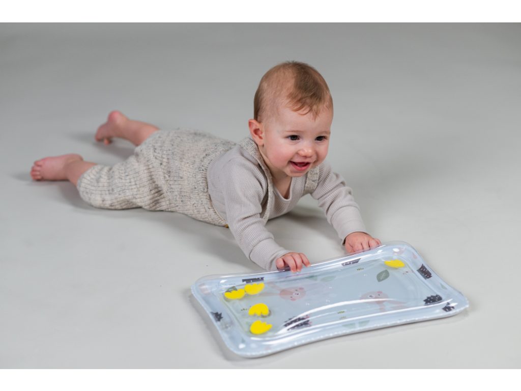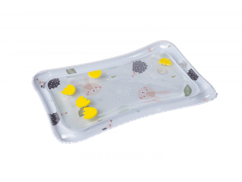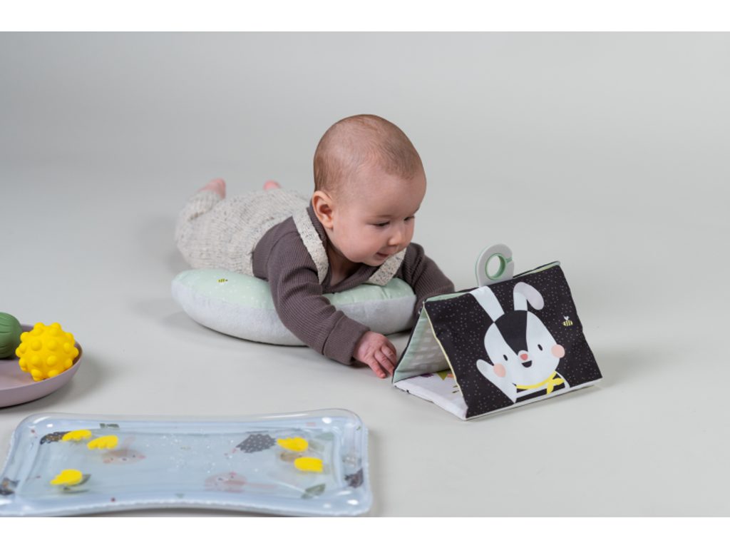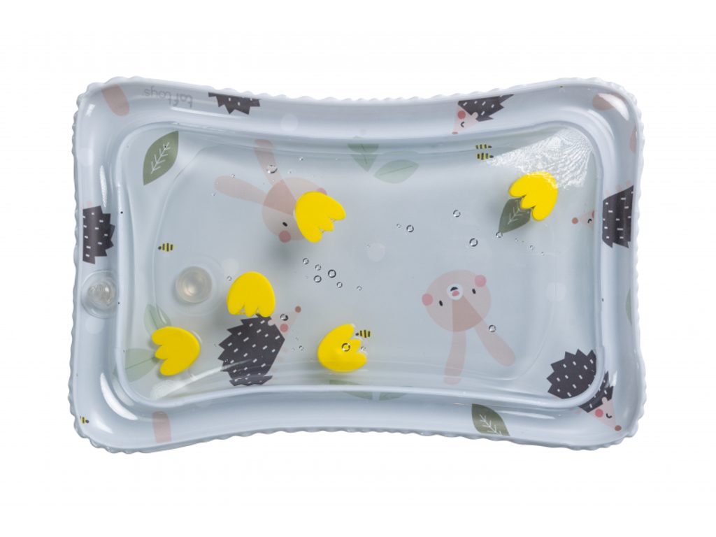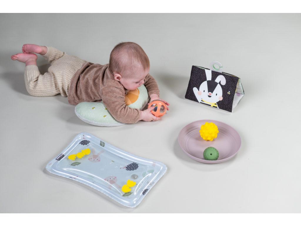 Polštářek z měkkého, příjemného materiálu je speciálně navržený, aby podporoval hraní dítěte na bříšku. Oboustranná šusticí kniha je ideální pro postavení před dítě v poloze na bříšku. Množství obrázků, které kniha nabízí, umožňuje rodičům obrázky vyměňovat a udržovat tak déle pozornost dítěte. Hru na bříšku podporuje i vodní hrací podložka s výraznými žlutými květinami, které se ve vodě při zmáčknutí podložky pohybují a upoutávají tak pozornost dítěte.